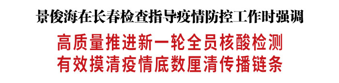 今天,省委书记景俊海在长春检查指导疫情防控工作。他强调,要深入贯彻习近平总书记关于疫情防控工作的重要讲话重要指示精神,按照孙春兰副总理调研指示要求,紧张起来、动员起来、行动起来,从严从紧,刻不容缓,高质量推进新一轮全员核酸检测,有效摸清疫情底数、厘清传播链条,采取更坚决、更有效、更果断举措,坚决遏制住疫情扩散蔓延。
