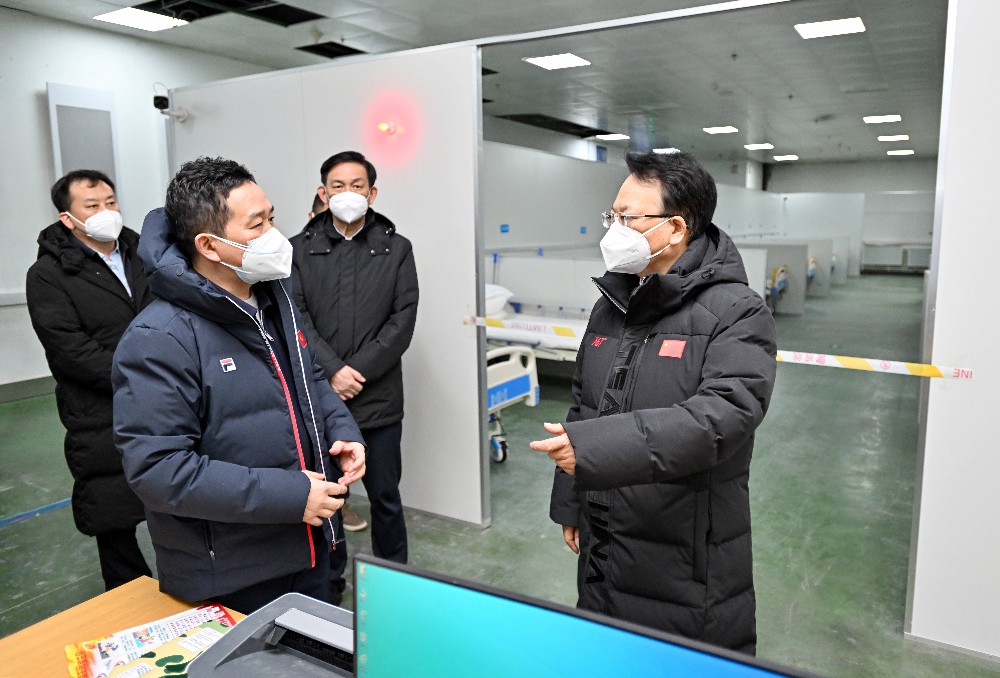 3月15日,省委书记景俊海在长春检查指导疫情防控工作,在长春国际会展中心方舱医院实地察看设施配备情况。