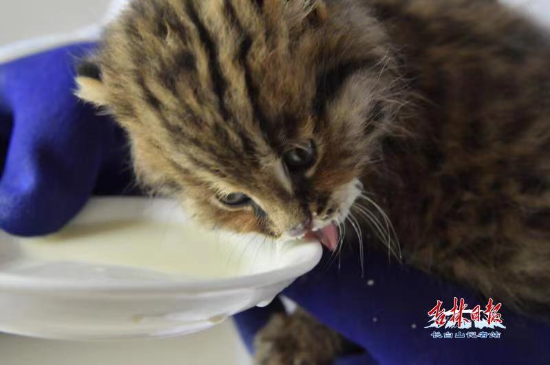 5月31日上午9时,在野生动物救护站,记者观察到这只背面体毛为棕黄色的“新朋友”,全身布满不规则黑斑点,从头部至肩部有四条黑褐色条纹,两眼内侧向上至额后各有一条白纹,机灵可爱的豹猫见我们造访,有些不安地迅速躲到角落里。兽医崔秀成戴好手套,端来羊奶,准备对豹猫进行喂食。年幼的豹猫闻到香味,挡不住诱惑奔向装羊奶的容器,用舌头舔喝着羊奶,这时崔兽医用镊子夹一小撮肉末,小家伙狼吞虎咽地吃起来。