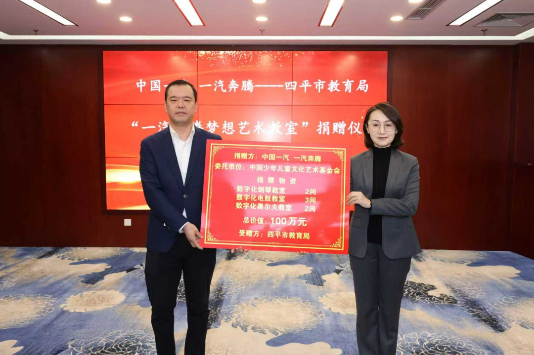 10月29日,“一汽奔腾艺术梦想教室”捐赠仪式在四平市举行,四平市政府、中国一汽党委工作部、一汽奔腾及中国少年儿童文化艺术基金会主要领导出席捐赠仪式。 此次共向四平市教育局捐赠7间“一汽奔腾梦想艺术教室”,总价值100万元,彰显一汽奔腾与四平市的坚实合作基础和深厚政企情谊,为双方协同发展增添文化暖流,将为四平市中小学生注入源源不断的美学滋养。