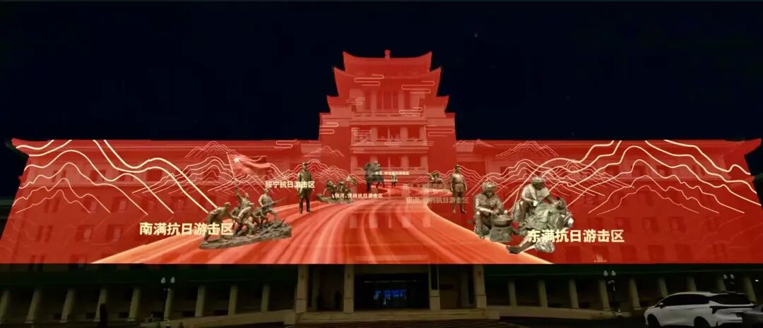 当第一缕红光漫过古朴的墙面,观众将瞬间被带入那段烽火连天的岁月。光影秀的开篇聚焦于“东北抗联史实”,运用沉浸式特效,生动再现了抗联战士在林海雪原中“火烤胸前暖,风吹背后寒”的艰苦卓绝。这不仅是对十四年抗战史的深情回望,更是一场庄严肃穆的精神洗礼,旨在让白山黑水间淬炼出的东北抗联精神,于新时代的光影中澎湃不息,薪火相传。