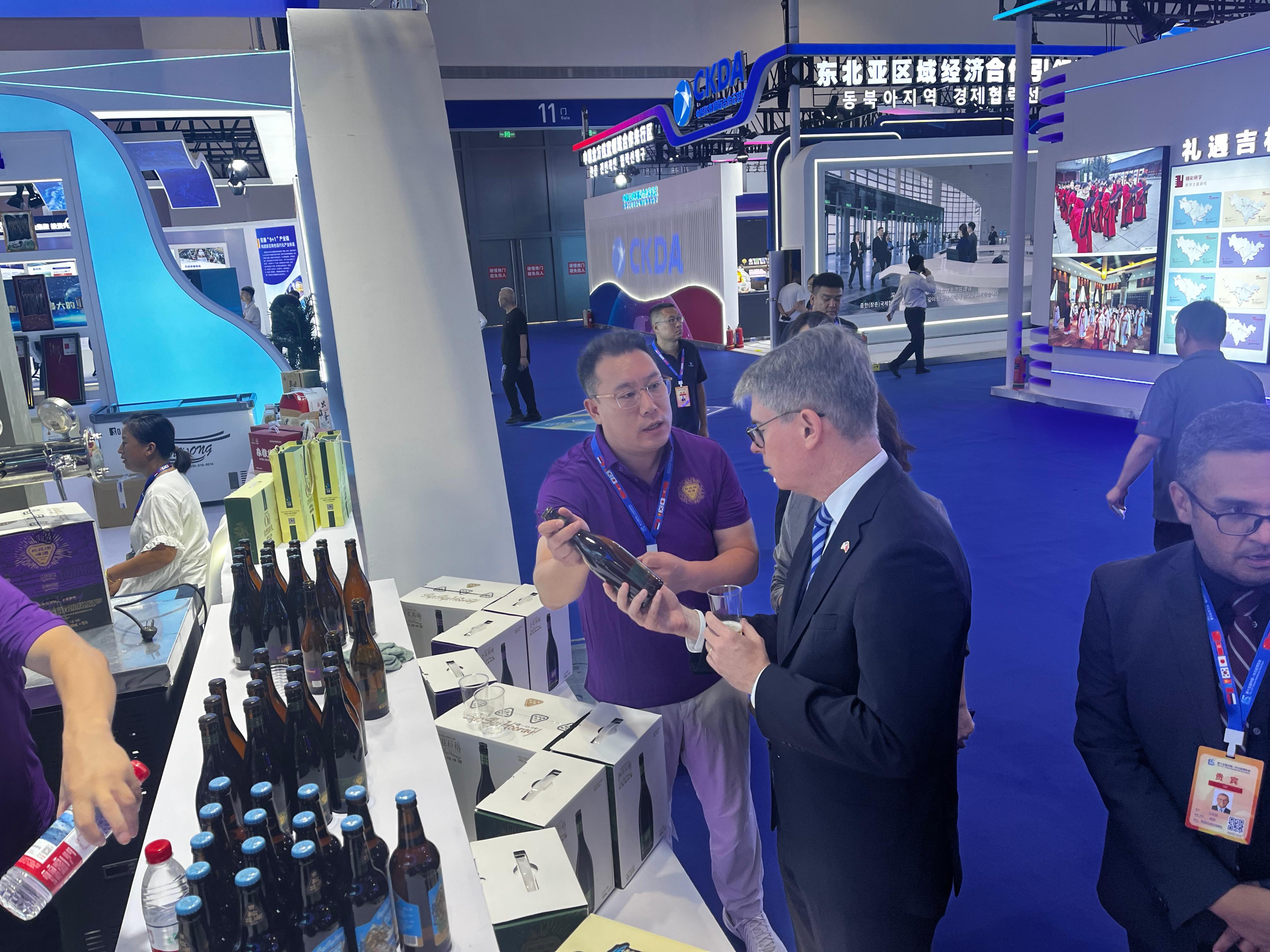 在免费品鉴区,吉林市自有品牌——松花湖啤酒备受关注。此次该品牌带来了全新推出的两款产品:全麦黄啤和酒花拉格。据所属企业奥吉通公司负责人钱丞介绍,全麦黄啤口感清爽,泡沫绵密,麦香回甘,酒体透亮;酒花拉格则突出啤酒花香气,入口甘醇并略带苦味。这两款新品即将全面上市,引发不少观众期待。美国驻沈阳总领馆总领事何溯源在品尝了不同口味的几款松花湖啤酒后,用中文笑称:“都好喝!”