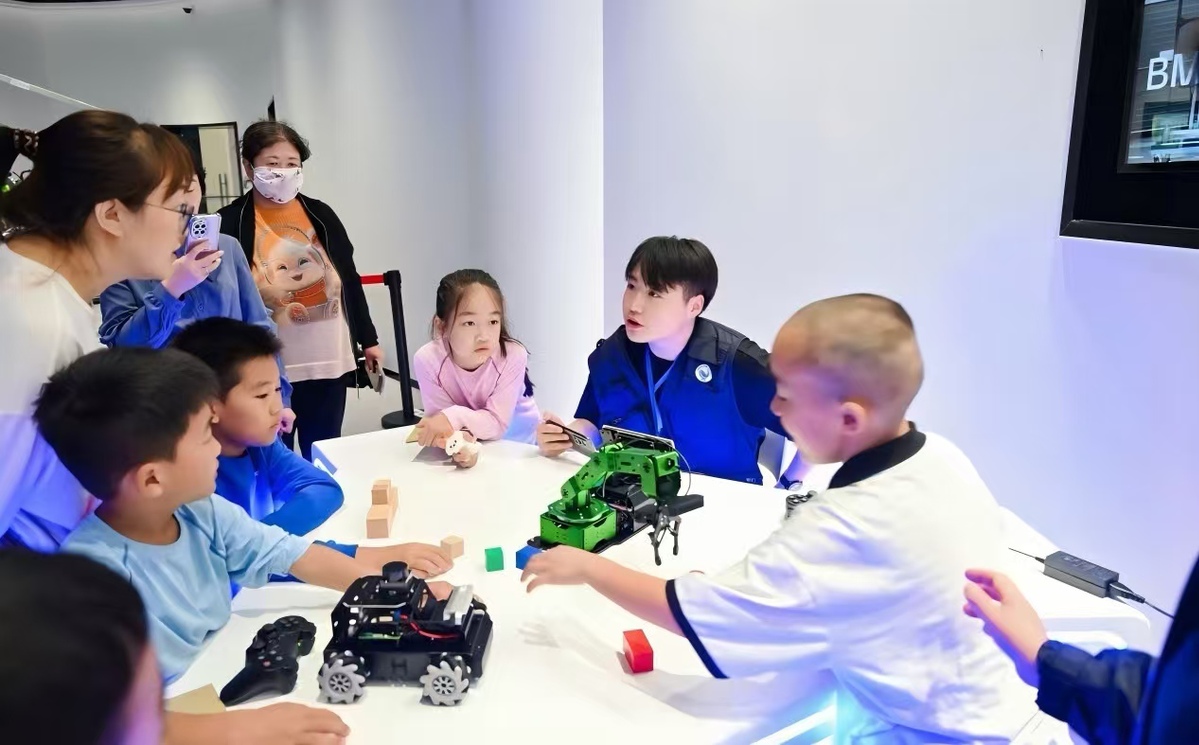 具身智能创意工坊充满动手实践氛围。“小小工程师”体验区,孩子专注拼装简易机械,通过图形化界面指挥机器人动作;操作区,孩子操控机器人互动。家长陪伴、成年人探索,众人在实践中感受智能技术,让“具身智能”变得可感知。