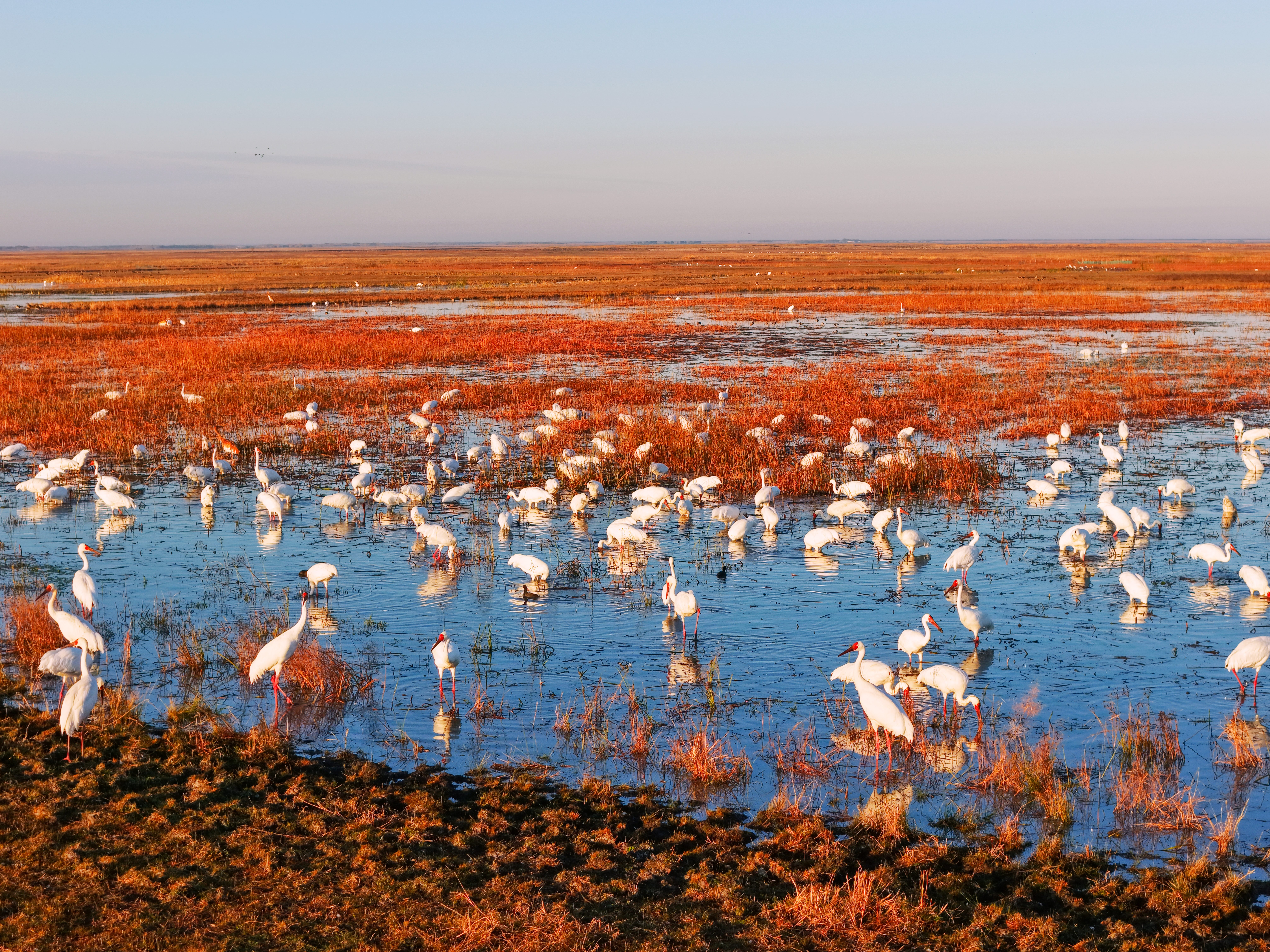在镇赉县的多个湿地监测点,一幅幅生机勃勃的候鸟群像跃然眼前。国家一级保护动物、世界极危物种白鹤,宛如优雅的白色精灵,种群数量达2000余只,它们在湿地间欢快觅食、不时翩翩起舞,仿佛是大自然派来的使者。灰鹤的数量更是突破了3000只,它们身姿矫健,时而翱翔天际,时而低头觅食。白头鹤、白枕鹤等珍稀鹤类也纷纷亮相,为这片湿地增添了一抹神秘而珍贵的色彩。国家二级保护动物白琵鹭在当地繁殖量也逐年递增,其种群持续扩大,单次观测就能发现超千只的种群。它们整齐地排列在浅水湿地中,集体觅食的场景蔚为壮观。