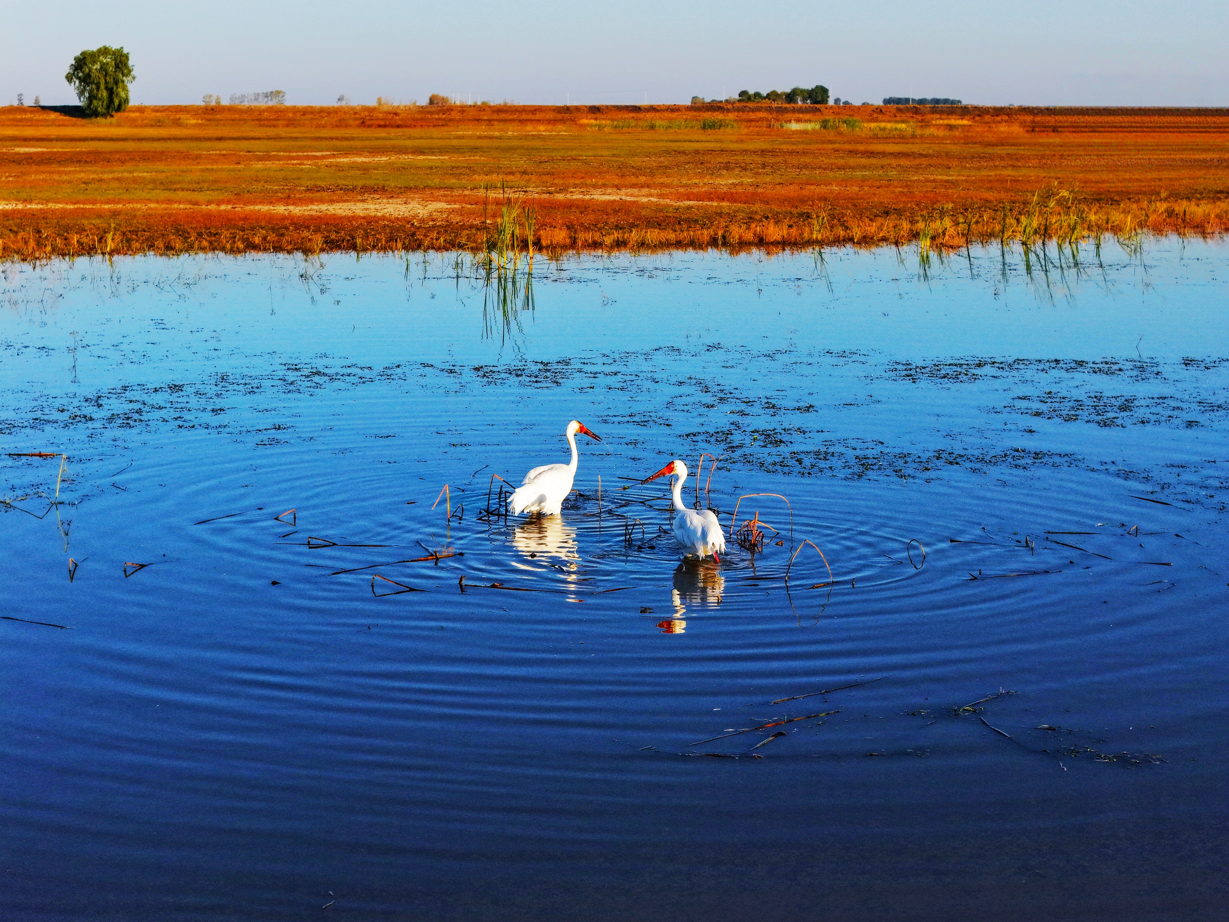 爱干净的鹤类、雁鸭更是把这里当成了自己的美容院,每日花费大量时间精心梳理羽毛,让自己始终保持优雅的姿态。灰鹤在水中嬉戏洗澡的画面被镜头定格,它们欢快地扑腾着翅膀,溅起一朵朵晶莹的水花。东方白鹳则像一位位优雅的绅士,在湿地与稻田间悠然踱步,精准地捕捉着小鱼与螃蟹,每一步都透露出自信与从容。野鸭、大雁则以数千只的规模集体栖息于湿地、草原与农田,当它们群起飞翔时,遮天蔽日的场面犹如一场壮观的航空表演,让人不禁感叹大自然的神奇与伟大。