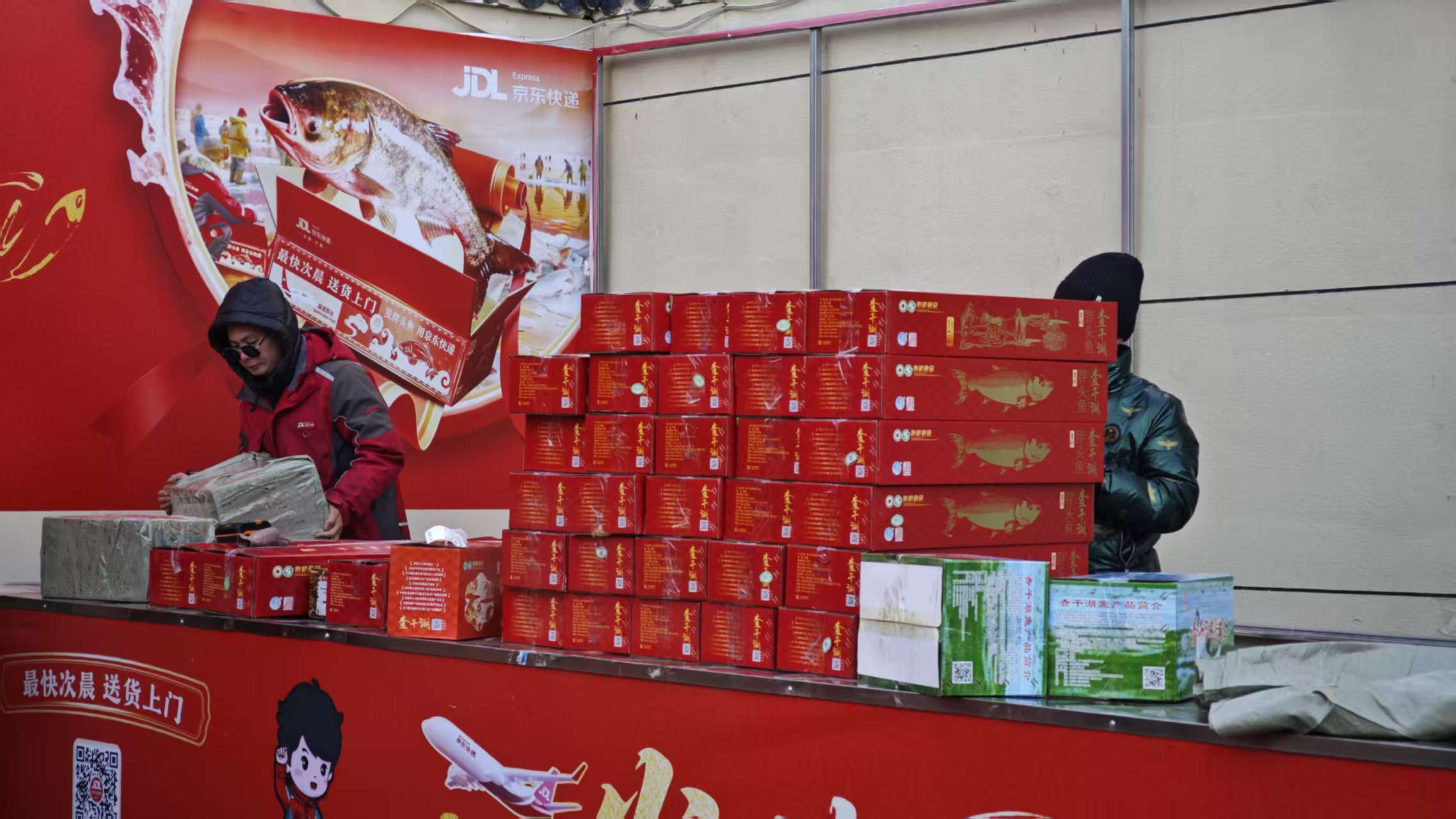 在仓库大院门口,多家物流公司现场设立邮寄站点,游客选购后可直接就地寄送。为保障湖鲜的品质与新鲜度,当地依托完善的现代化物流体系,搭建起一条从湖面捕捞到百姓餐桌的全程冷链运输网络。“每天都有许多游客选择快递邮寄查干湖鱼产品,省时又省力,现在我们发货的鱼最远已经送达广州、深圳等多个南方城市。”一家物流公司工作人员介绍。