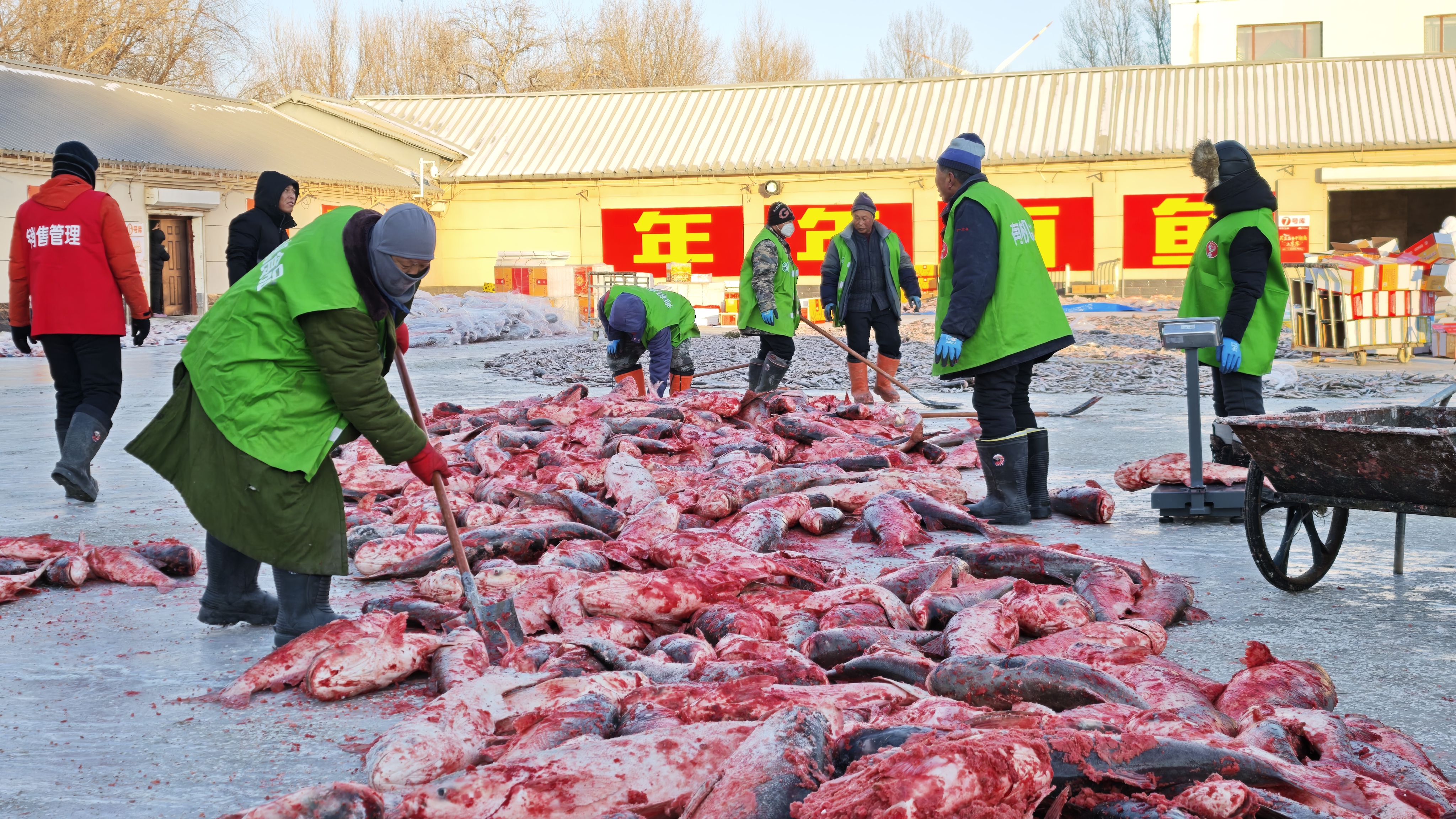 记者日前在查干湖渔业公司仓库大院看到,满载大鱼的车辆刚一驶回,渔工们便立刻忙碌起来,按照鱼的品种、大小进行细致分拣。来自南京的游客徐先生正在院内挑选胖头鱼,他兴奋地说道:“第一次来查干湖看冬捕,场面太震撼了!选一条鱼寄回家,让家人也尝尝地道的查干湖鲜味。”