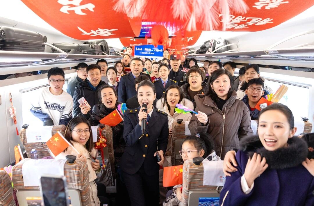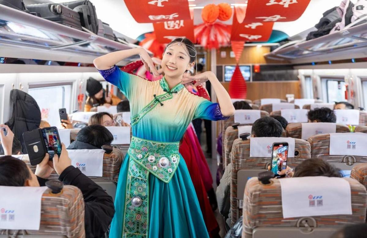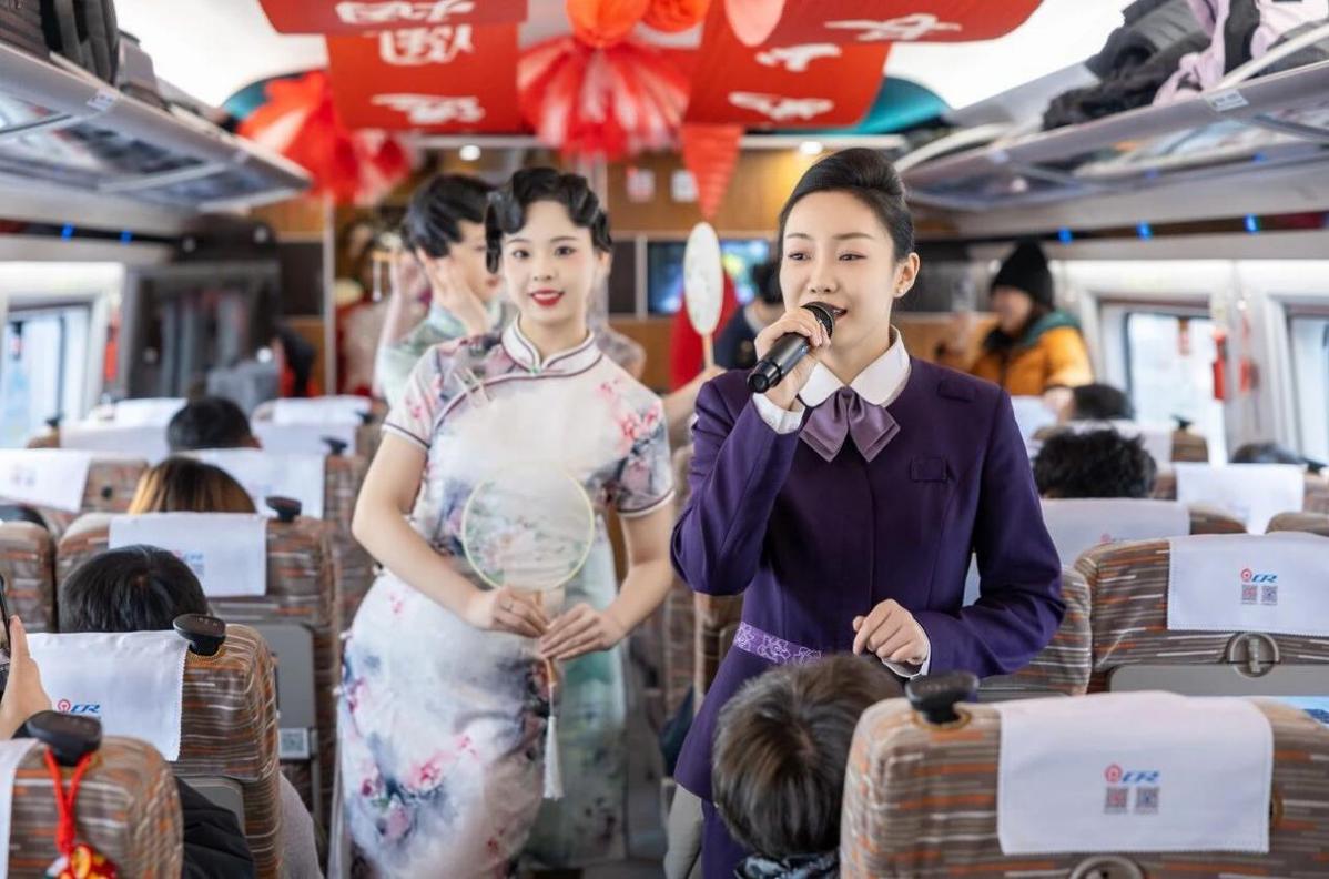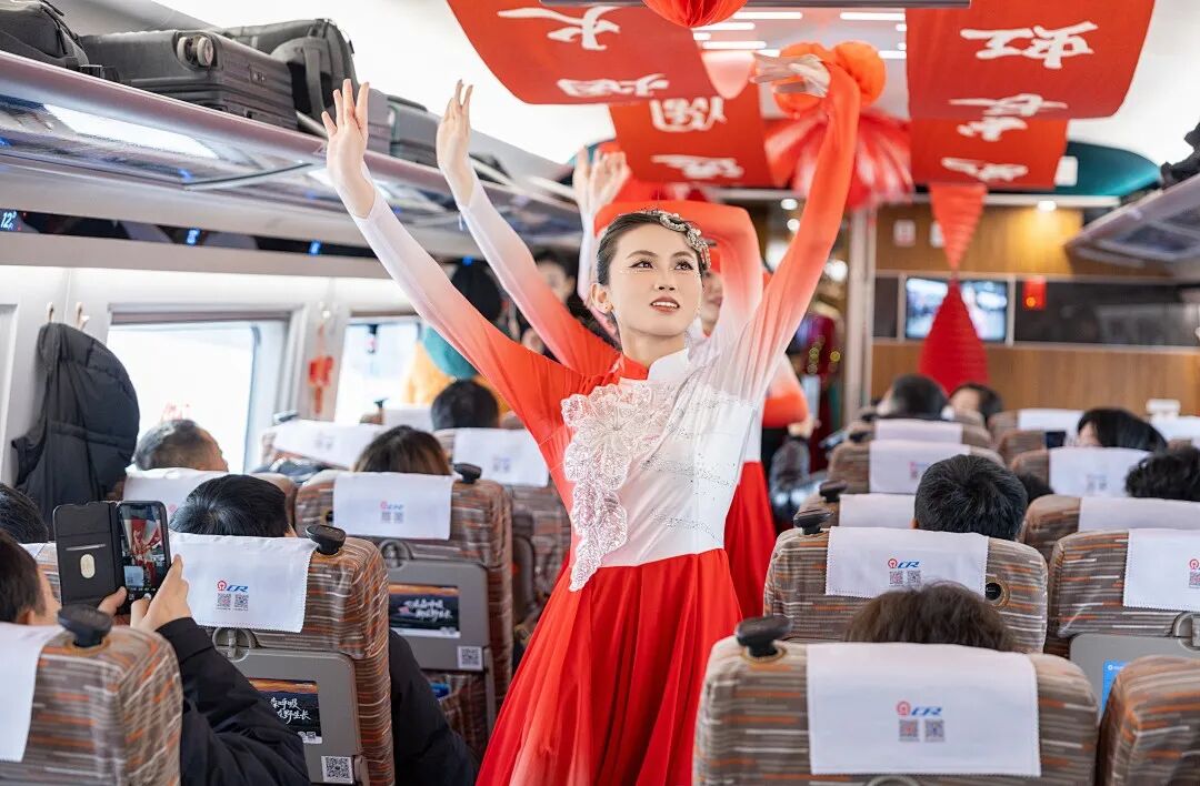登上列车,浓郁的年味扑面而来。红彤彤的中国结高悬车顶,写满真挚祝福的窗花点缀车窗,各式福字相映成趣,与车外的皑皑白雪构成一幅冷暖交织的动人画卷。11时10分,列车准时鸣笛启程,“首发起航,一路长虹!” 主持人的宣告拉开了列车联欢活动的序幕。《美丽中国》的舒展舞姿、《声声慢》的古典韵味与《青花瓷》礼仪操的优雅风范轮番上演,精彩节目引得旅客们频频鼓掌叫好。互动环节中,印有 “长虹号” 标志的纪念品被送到旅客手中,传递着满满的心意。